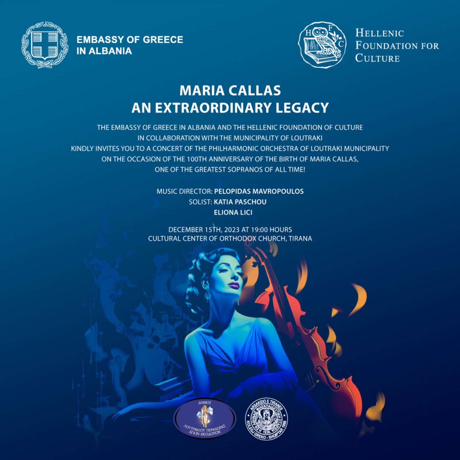Η Φιλαρμονική Λουτρακίου μετά από πρόσκληση του Ελληνικού Πολιτιστικού Ιδρύματος και της Ελληνικής Πρεσβείας στην Αλβανία, θα ταξιδέψει την ερχόμενη εβδομάδα στα Τίρανα και τον Αυλώνα με σκοπό να παρουσιάσει μία συναυλία – αφιέρωμα στη Μαρία Κάλλας με αφορμή τα 100 χρόνια από τη γέννησή της.