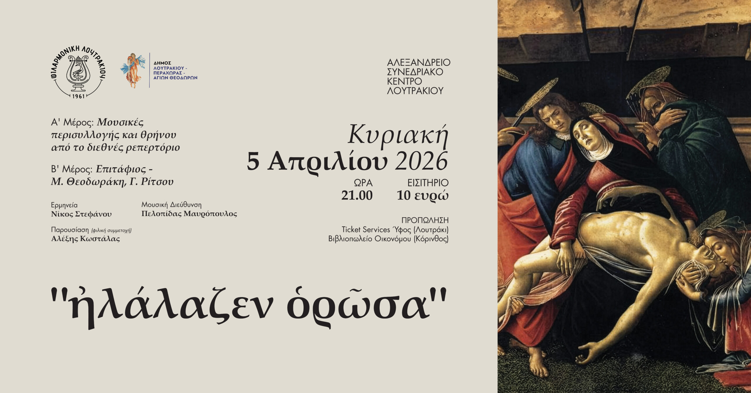 Προπώληση μέσω της Ticket Servises, από το κατάστημα Ύφος στο Λουτράκι και το Βιβλιοπωλείο Οικονόμου στην Κόρινθο.