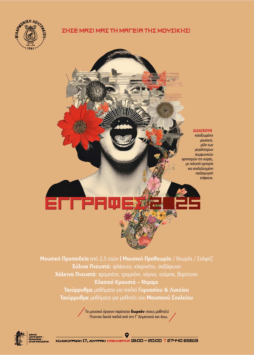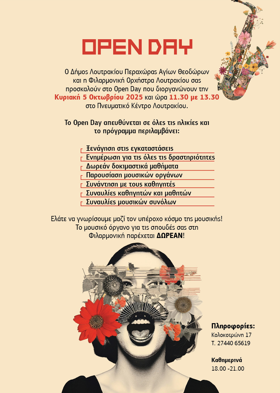 Ο Δήμος Λουτρακίου Περαχώρας Αγίων Θεοδώρων και η Φιλαρμονική Ορχήστρα Λουτρακίου σας προσκαλούν στο Open Day που διοργανώνουν την Κυριακή 5 Οκτωβρίου 2025 και ώρα 11.30 με 13.30 στο Πνευματικό Κέντρο Λουτρακίου (Κολοκοτρώνη 17).